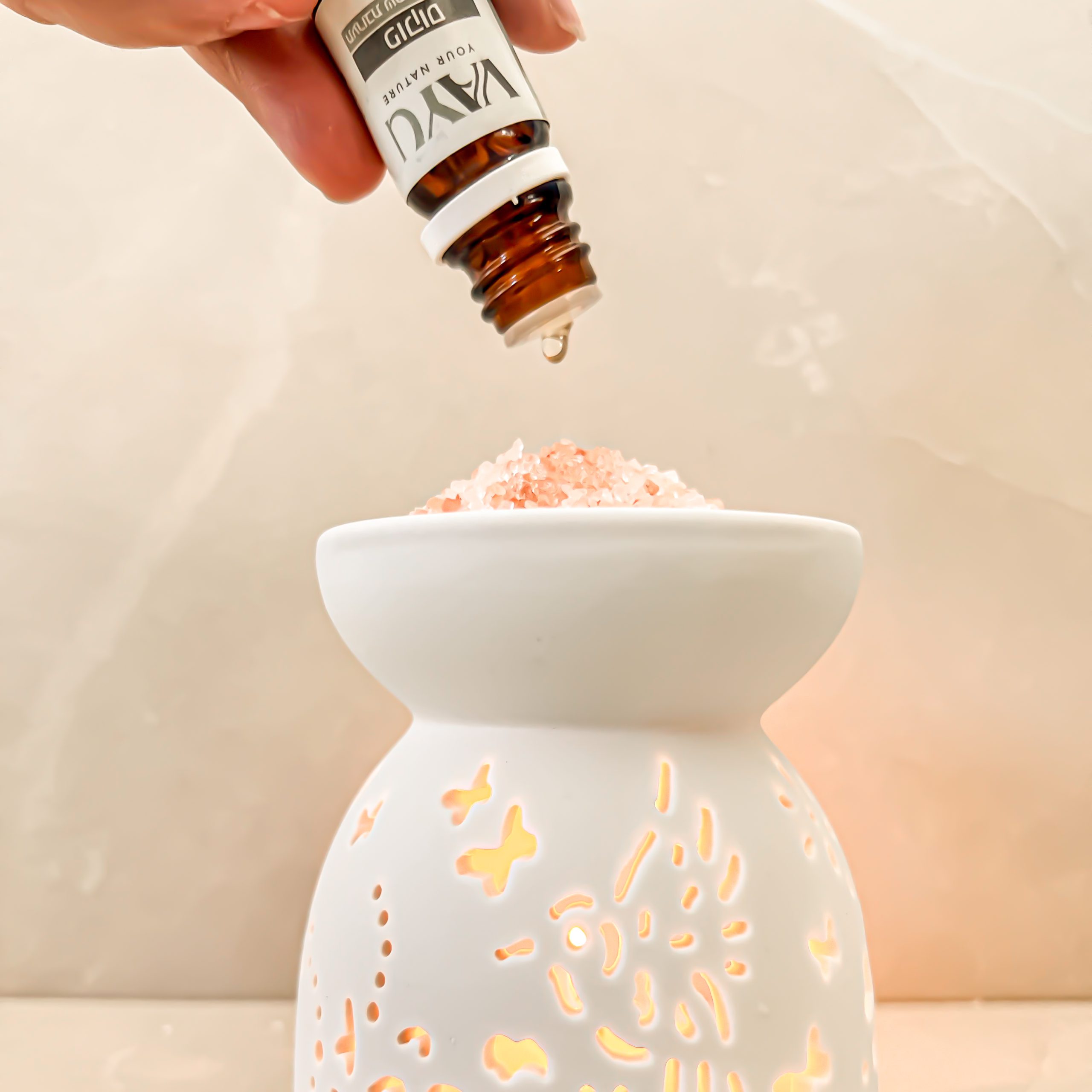 • בתחתית המבער מדליקים נר, בקערית העליונה שמים 2 כפות מלח גס ומטפטפים 8-15 טיפות שמנים אתריים תלוי בגודל החדר.