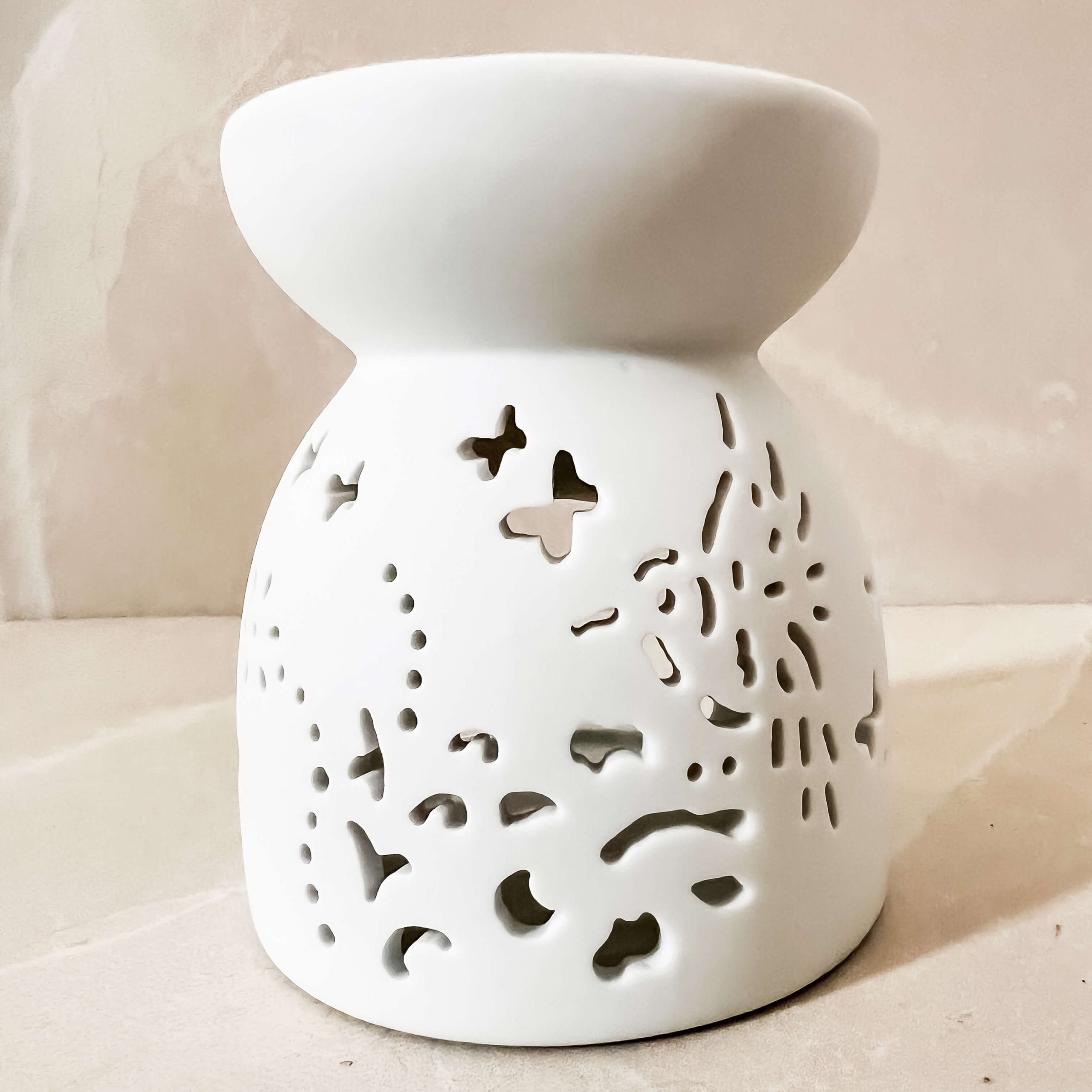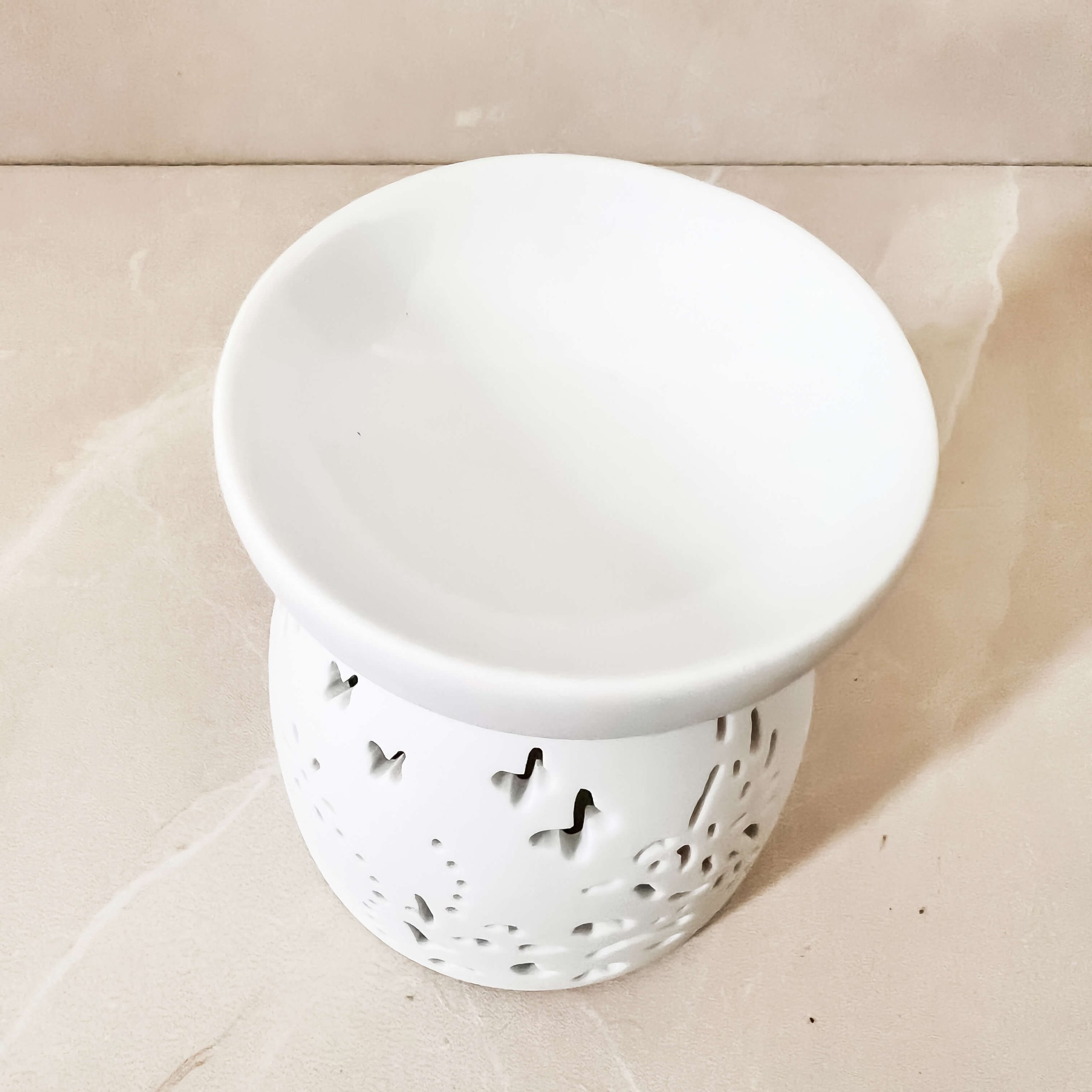 מבער שמנים אתריים בצבע לבן עם ציורים: לבבות, פרחים ופרפרים עשוי מקרמיקה